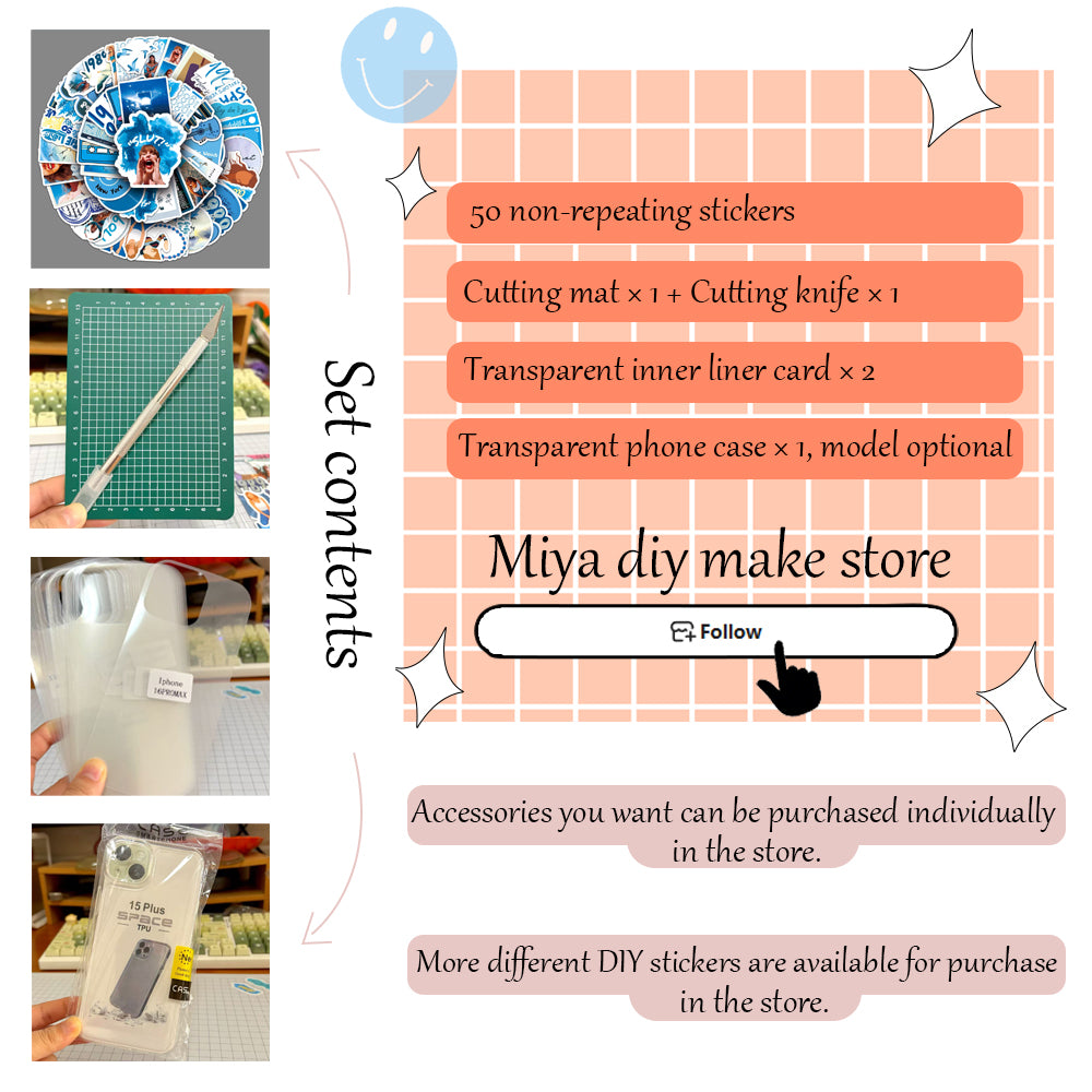 5:This is a fun and simple DIY kit. Our store offers other sticker styles to choose from. If you don't need the cutting tool set, you can purchase the clear phone case separately via other links. For those wanting more transparent phone case inserts to create various background designs, there are dedicated accessory links in the store where you can buy additional inserts. We will also launch custom sticker services later, so stay tuned!