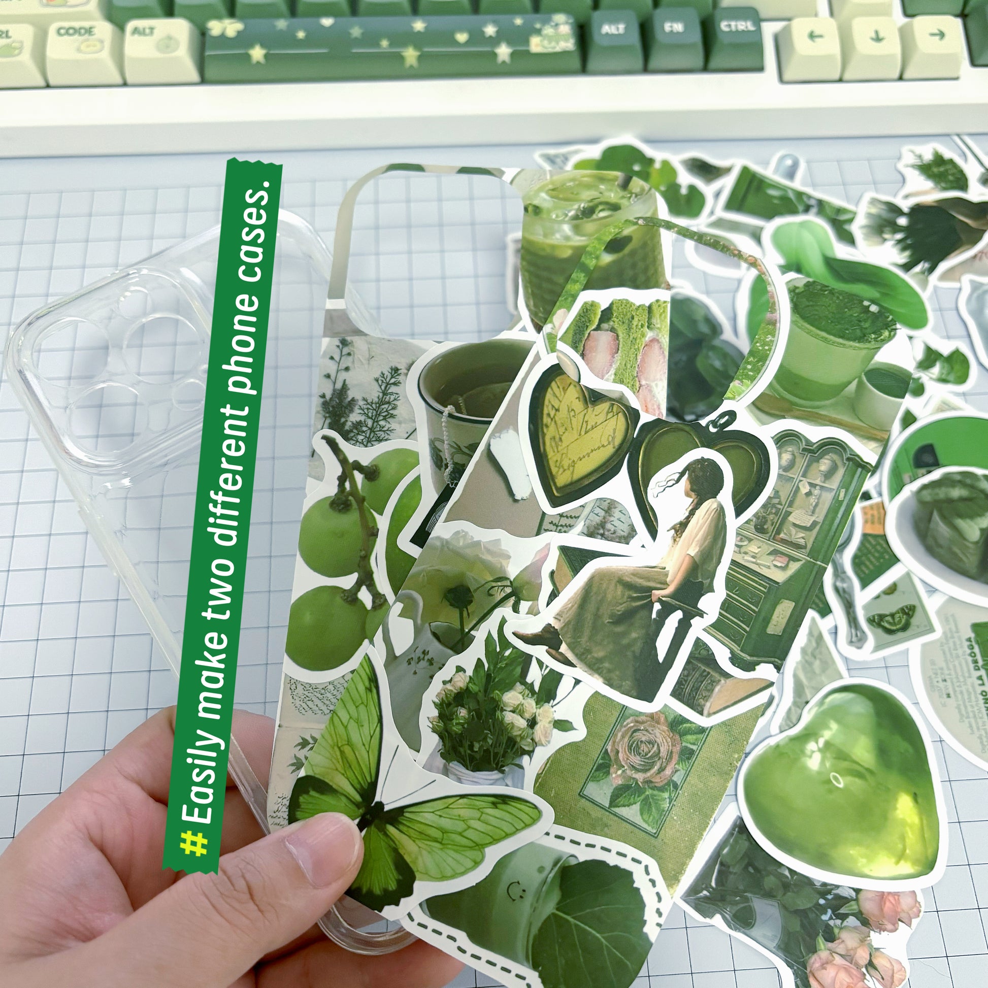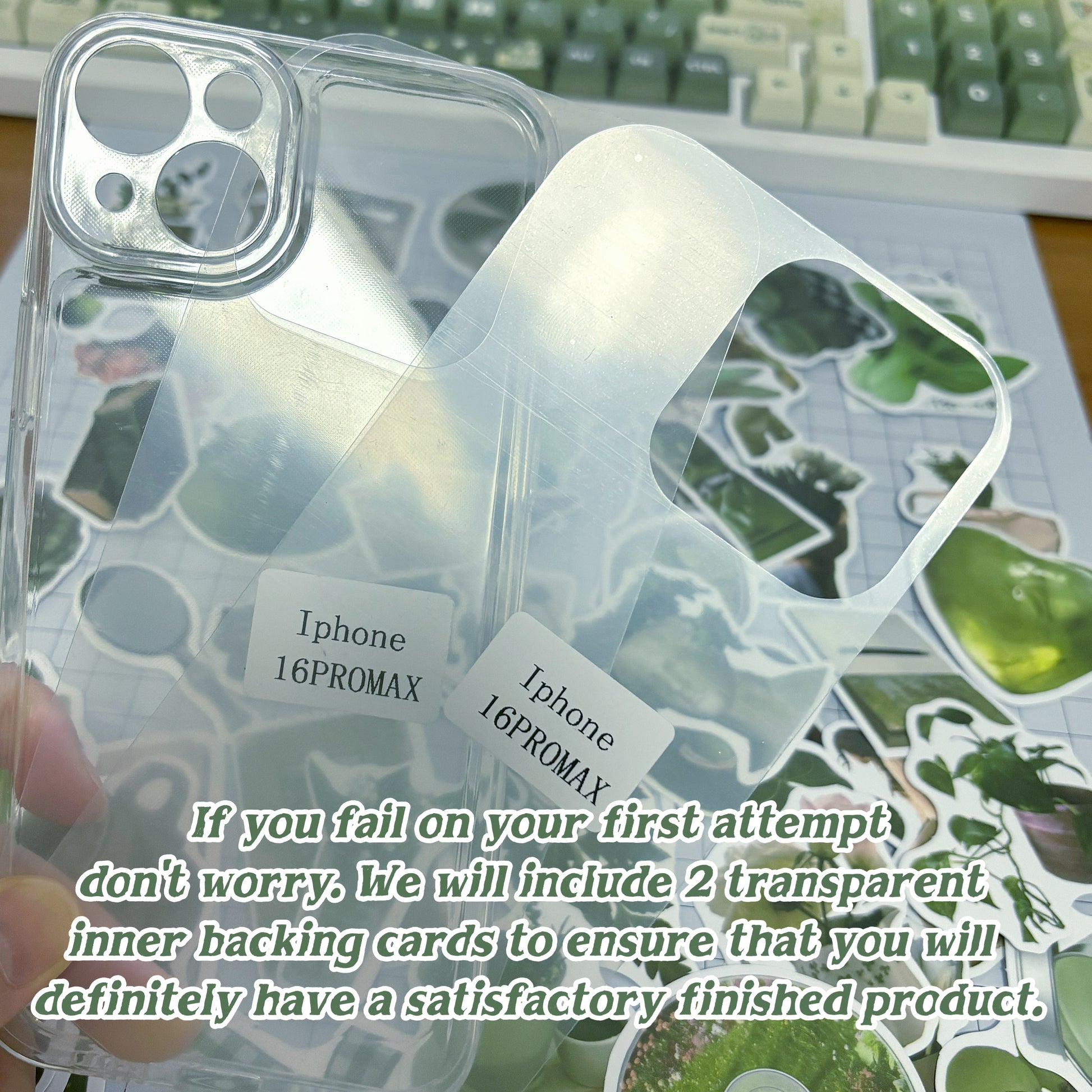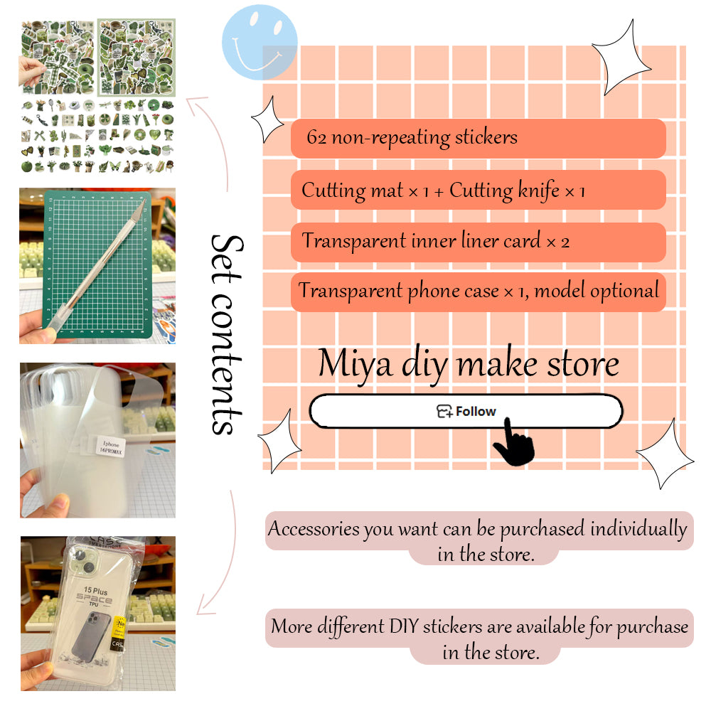 5:This is a fun and simple DIY kit. Our store offers other sticker styles to choose from. If you don't need the cutting tool set, you can purchase the clear phone case separately via other links. For those wanting more transparent phone case inserts to create various background designs, there are dedicated accessory links in the store where you can buy additional inserts. We will also launch custom sticker services later, so stay tuned!